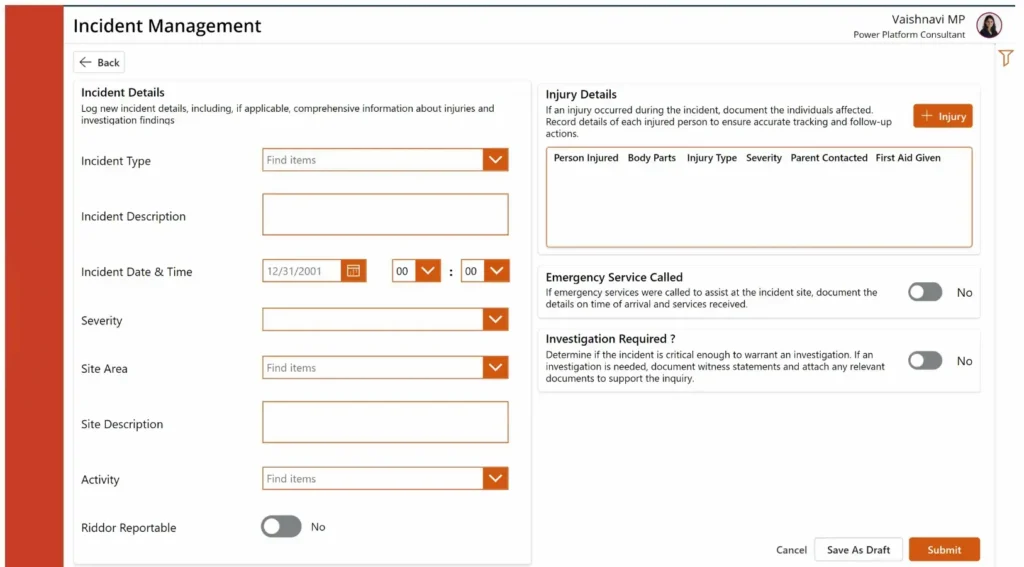 - Enable employees to log incidents with photos, descriptions, and priority levels via a custom app.