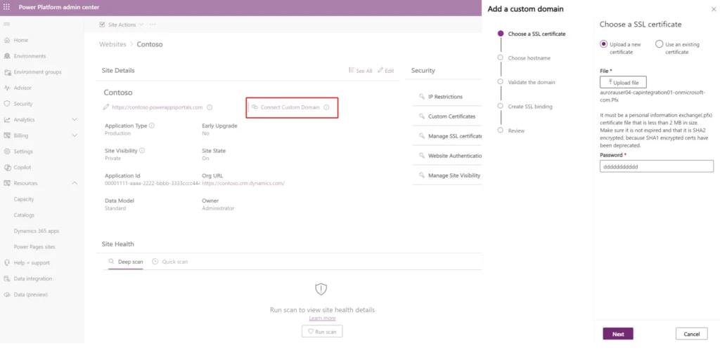 - Use Power Pages’ domain setup tool to link your custom domain.