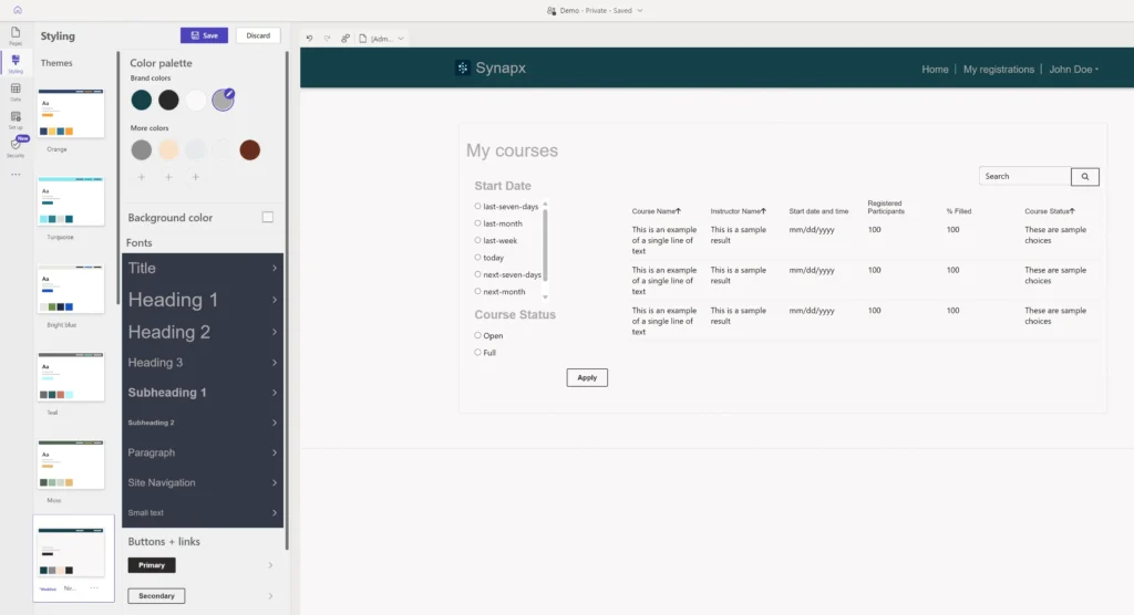 Power Pages comes with a built-in Style Editor that allows you to customise colours, fonts, and backgrounds, all without touching CSS. This editor provides flexibility to create a unique design while keeping things simple for non-developers.
