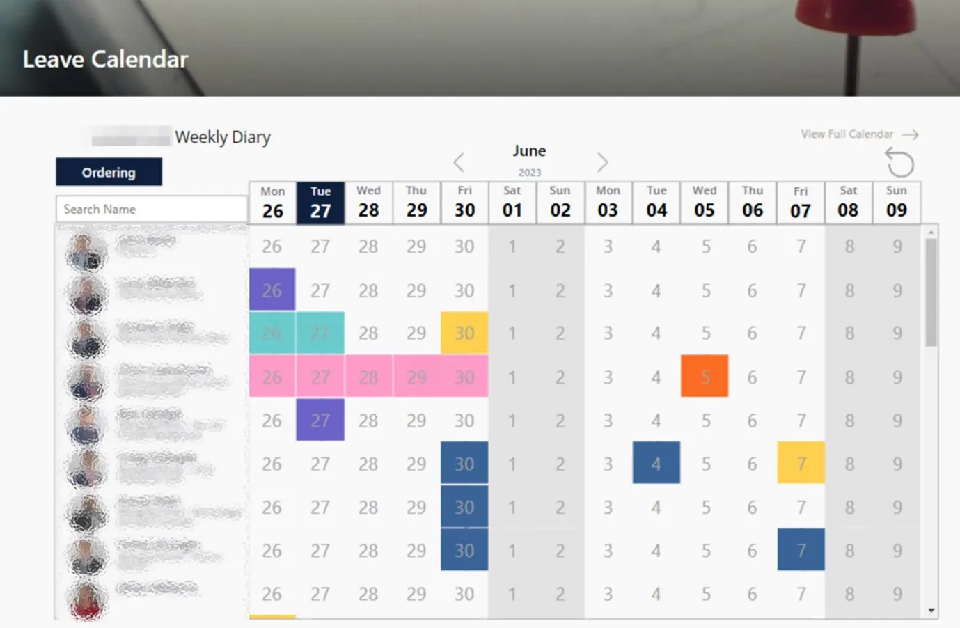 The client needed a way to quickly view employees on leave within the next two weeks, with the leave types color-coded for clarity, similar to the layout in the Timetastic tool. The calendar view had to preserve the existing order of users, with clear markings for the current day and weekends. Aesthetically, it was essential that the display closely resembled the third-party Timetastic application.